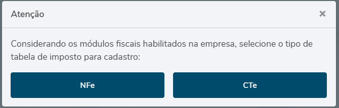 "Considerando os módulos fiscais habilitados na empresa, selecione o tipo de tabela de imposto para cadastro:"
