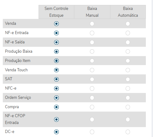 | DC-e | RadioButton | - | Sim | A escolher entre: Sem Controle Estoque, Baixa Manual eBaixa Automática |