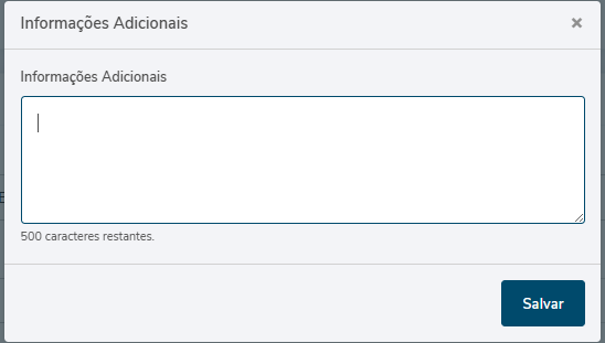 : o clique no botão deve realizar a abertura da dialog para inserção de informações complementares sobre o produto específico. O tamanho do campo é de 500 caracteres e a informação só a é salva com o clique no botão "Salvar". (O layout está antigo, seguir o novo padrão).