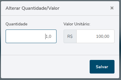 : o clique no botão de editar dialog de edição de quantidade e valor unitário do produto inserido. A informação só a é salva com o clique no botão "Salvar". (O layout está antigo, seguir o novo padrão).
