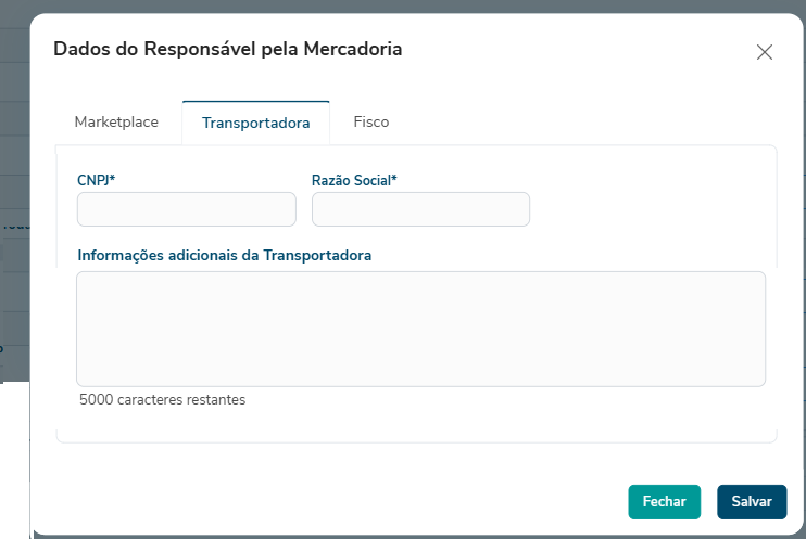 1. CNPJ*: placeholder (1): "Insira o CNPJ do Martketplace ". Placeholder (2): "Insira o CNPJ da Transportadora". Placeholder (3): "Insira o CNPJ do Orgão ".