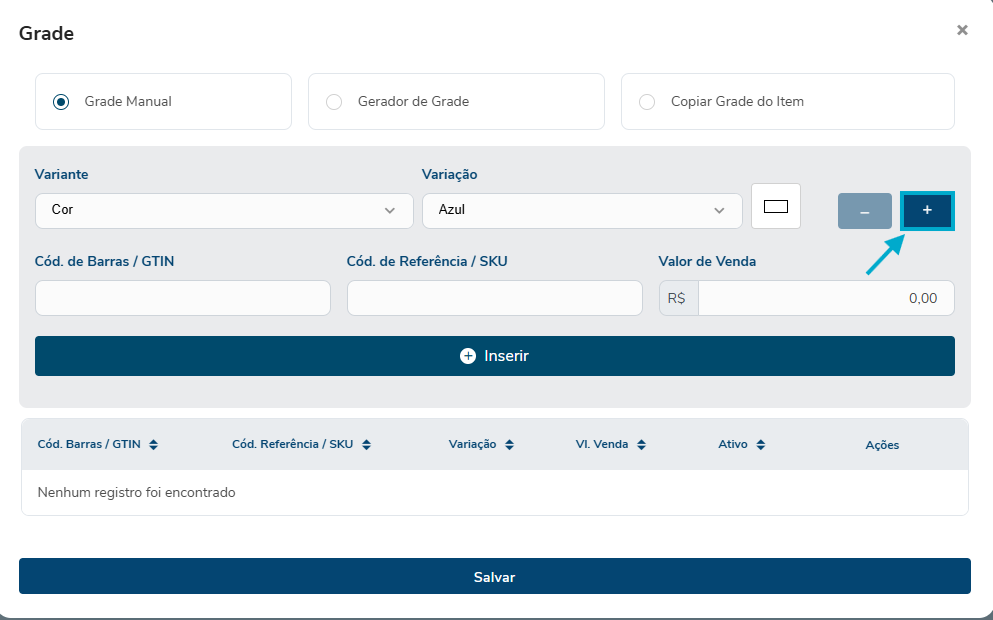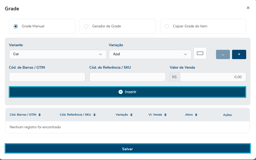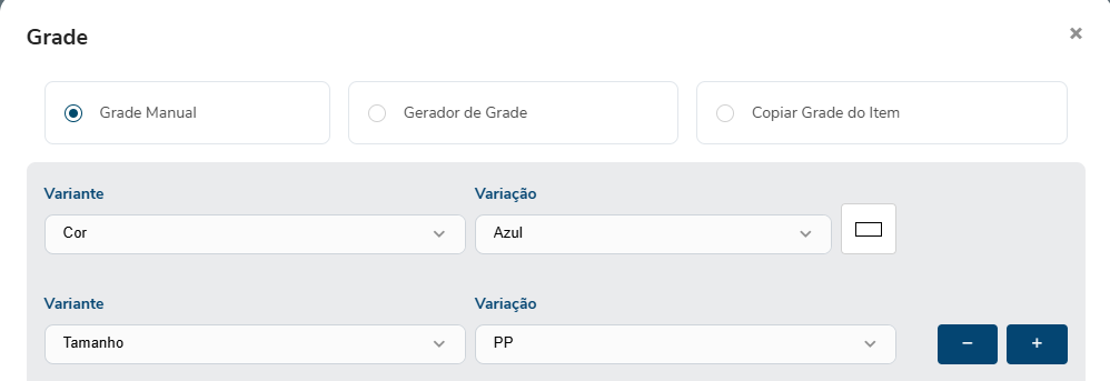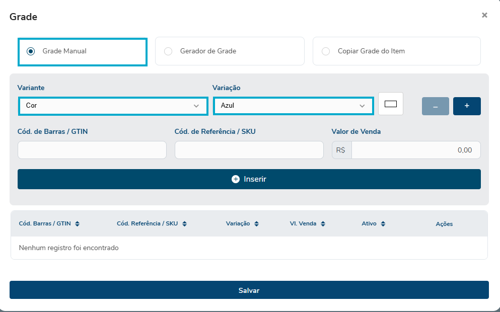 Na opção "Grade Manual", Escolha ou digite a VARIANTE e VARIAÇÃO: