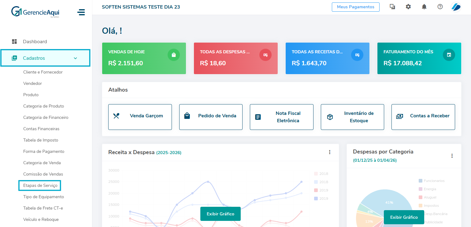 Clique em CADASTROS > ETAPAS DE SERVIÇO