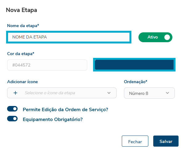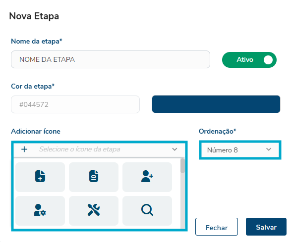 Após isso, defina também qual o ÍCONE e qual o NÚMERO DE ORDENAÇÃO (Exemplo: Se essa é a primeira etapa 1, etapa 2, etc).
