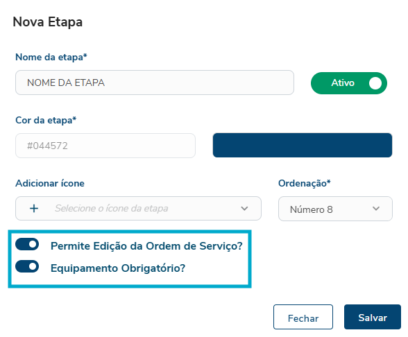"Permite Edição da Ordem de Serviço?": Caso habilitada, o sistema permitirá abrir a O.S para editar alguma informação. Caso desabilite, o sistema irá bloquear a edição da O.S quando a etapa for atribuída na O.S