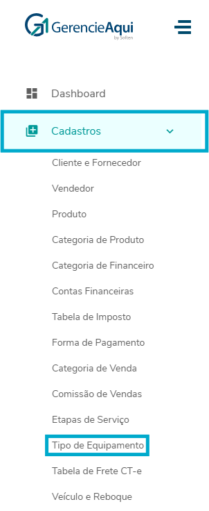 Clique em CADASTROS > TIPO DE EQUIPAMENTO