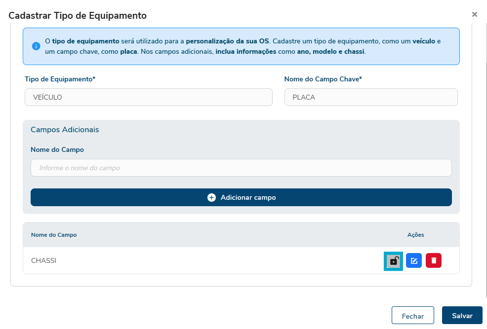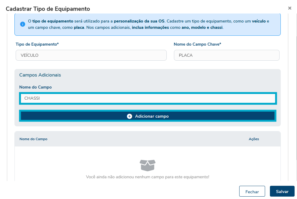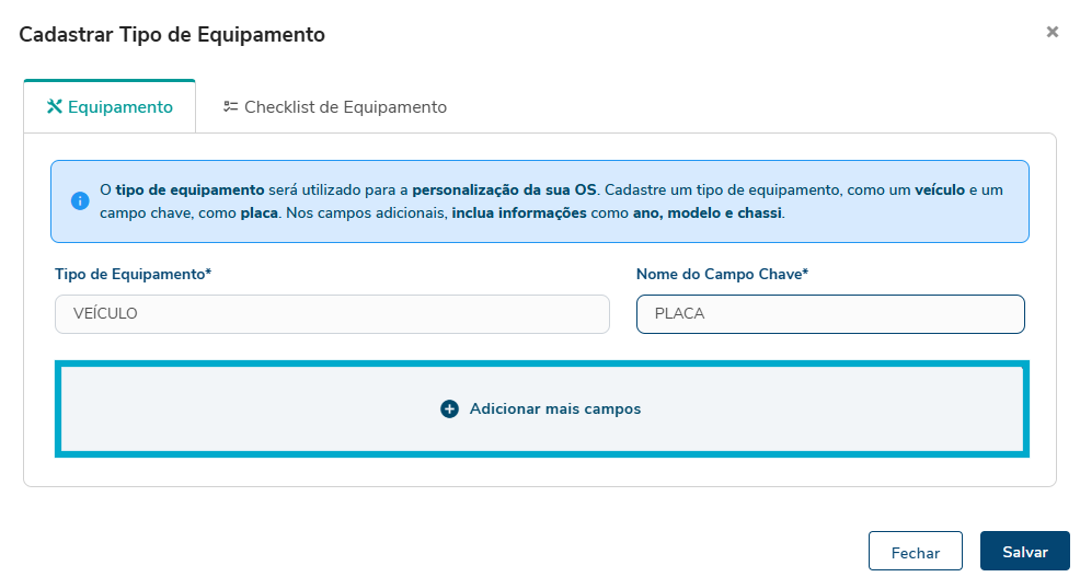 Em seguida, digite o nome do TIPO DE EQUIPAMENTO que irá utilizar, por exemplo "VEÍCULO" e também digite o nome do CAMPO CHAVE daquele tipo de equipamento. Como "PLACA" por exemplo.