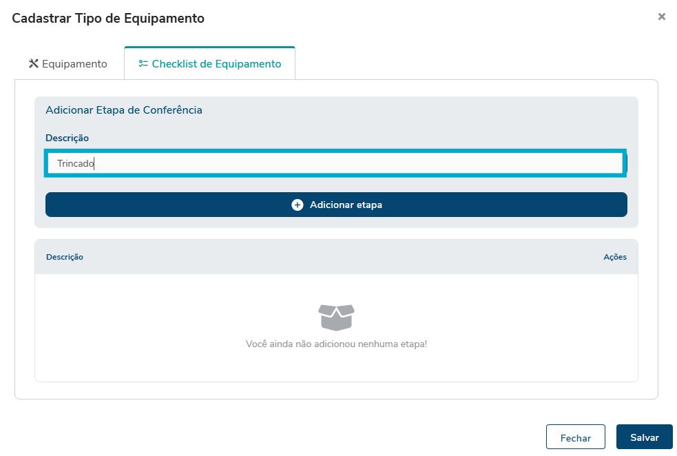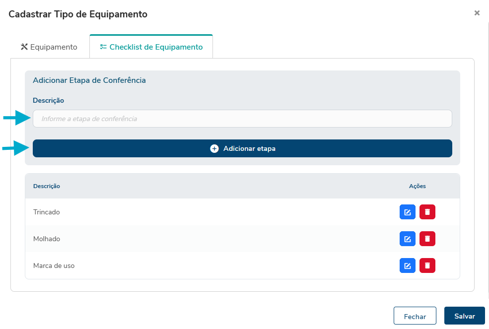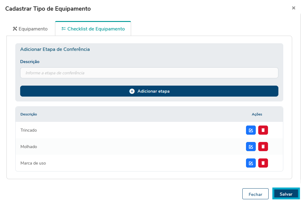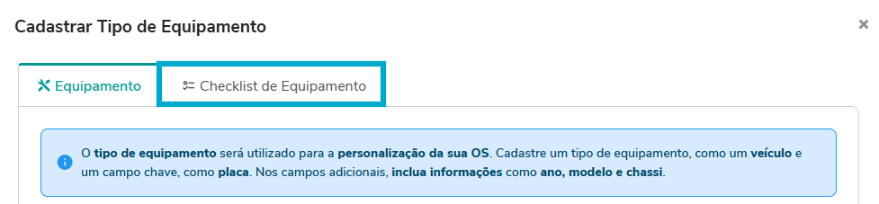 Para cadastrar uma checklist, basta clicar em "Checklist de Equipamento":