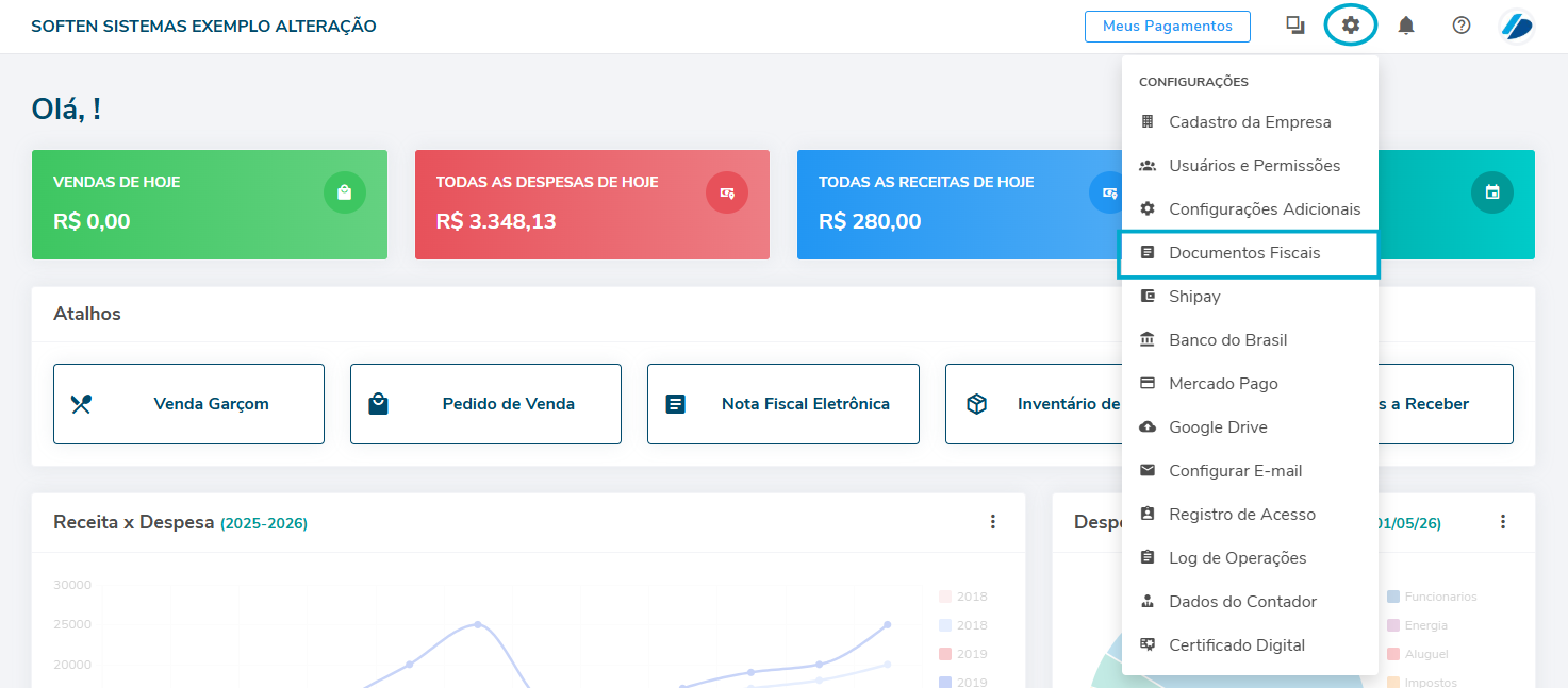 Clique no ícone de configurações (ENGRENAGEM) > DOCUMENTOS FISCAIS: