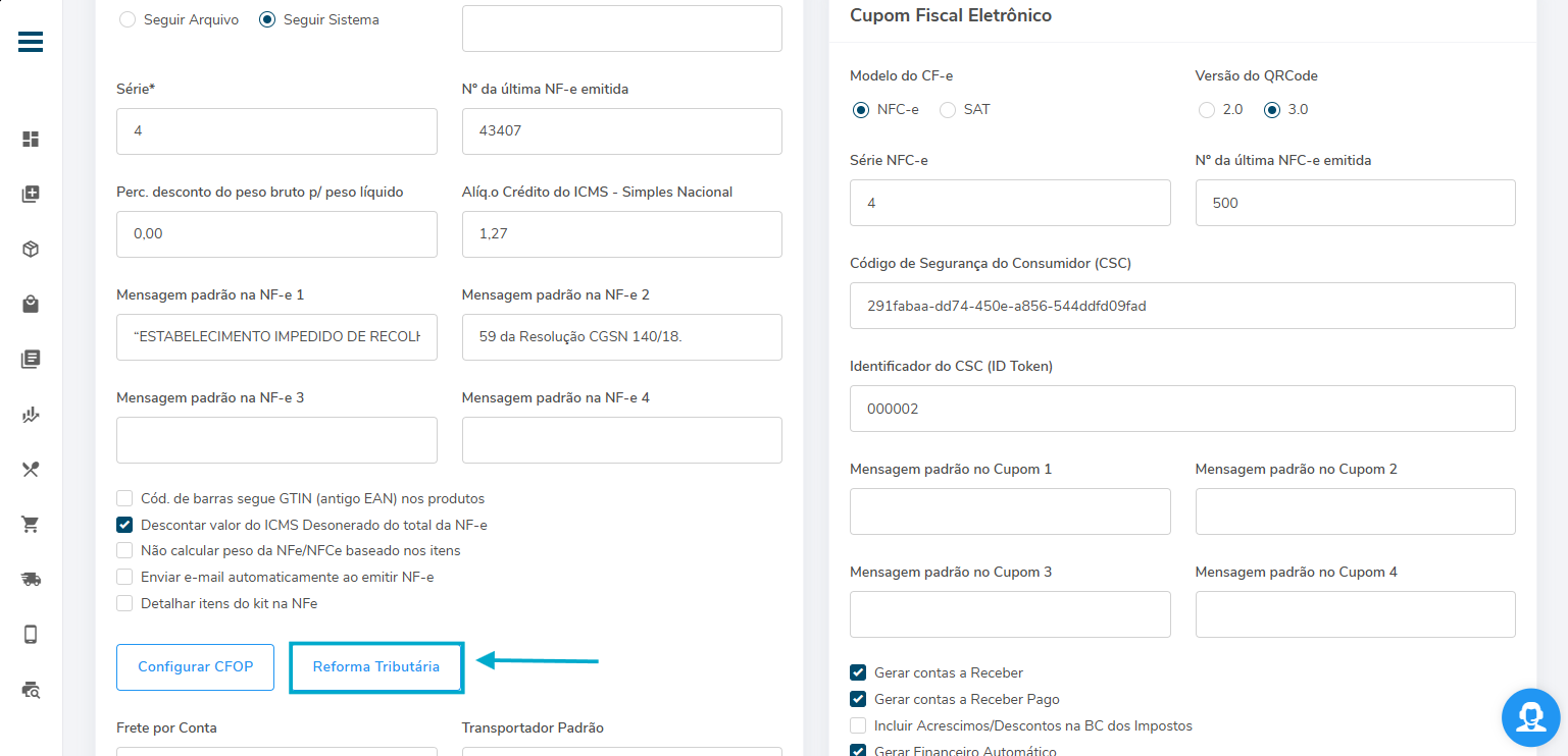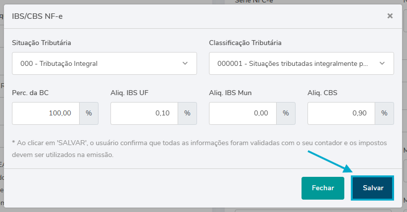 Por padrão, o sistema irá exibir uma configuração recomendada. Entretanto, o ideal é sempre confirmar com seu contador qual a configuração correta para sua empresa. Após preencher/conferir as informações, clique em "SALVAR"