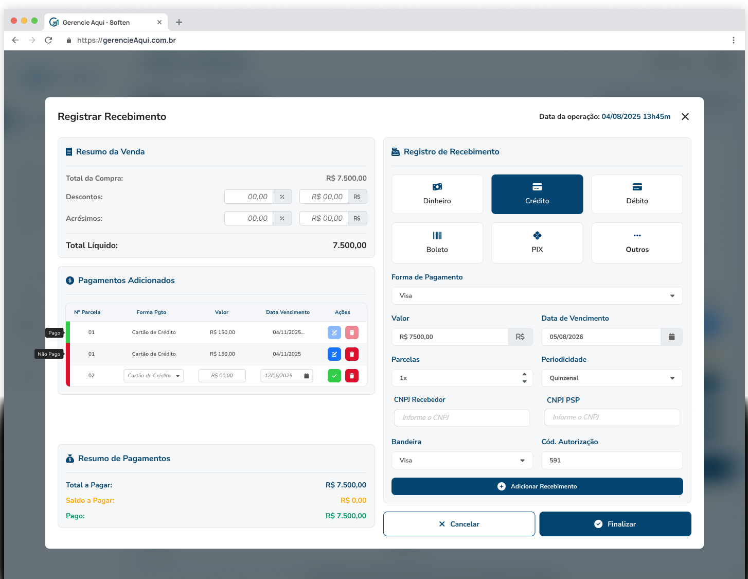 Valores preenchidos do grupo Registrar Recebimento e Resumo da Venda |
