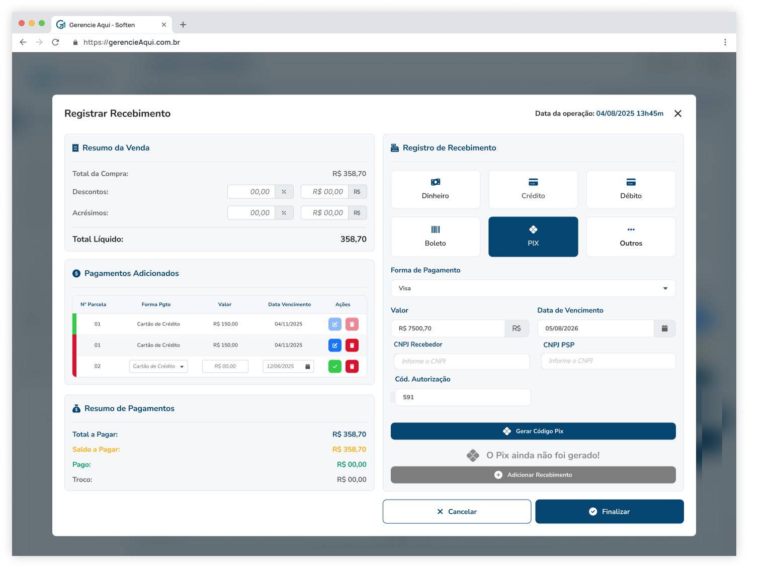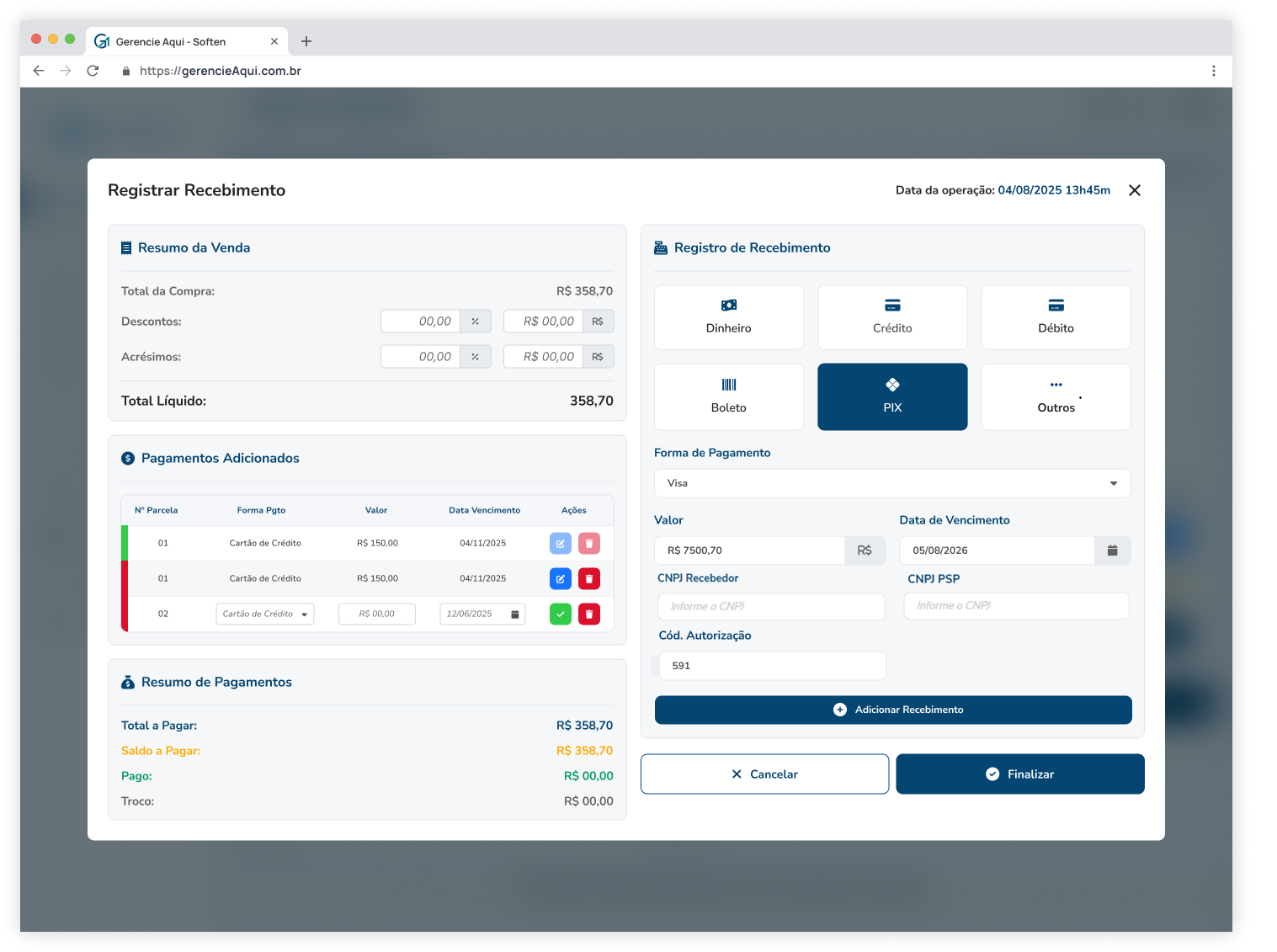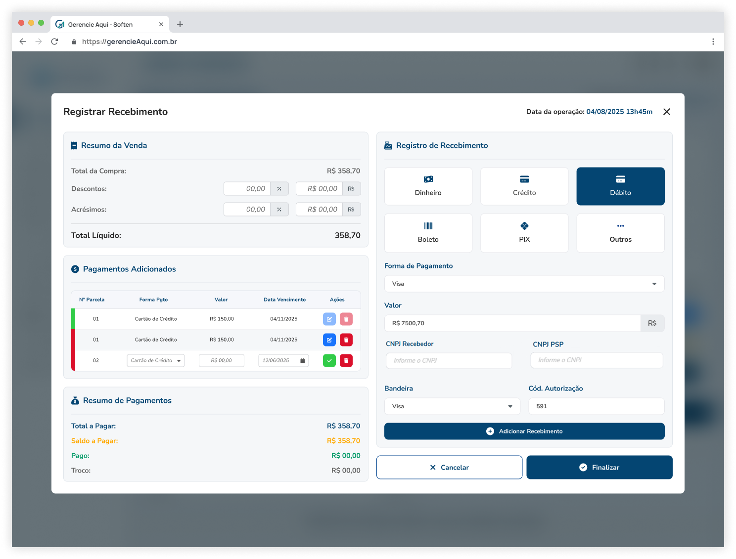 Valores preenchidos/editados do grupo Registrar Recebimentos, Pagamentos Adicionados e Resumo da Venda |