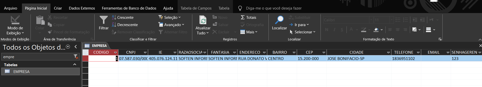 4.1) Na tabela empresa confirme se os dados puxaram após a sincronização, se não, preencha conforme os dados dos clientes.