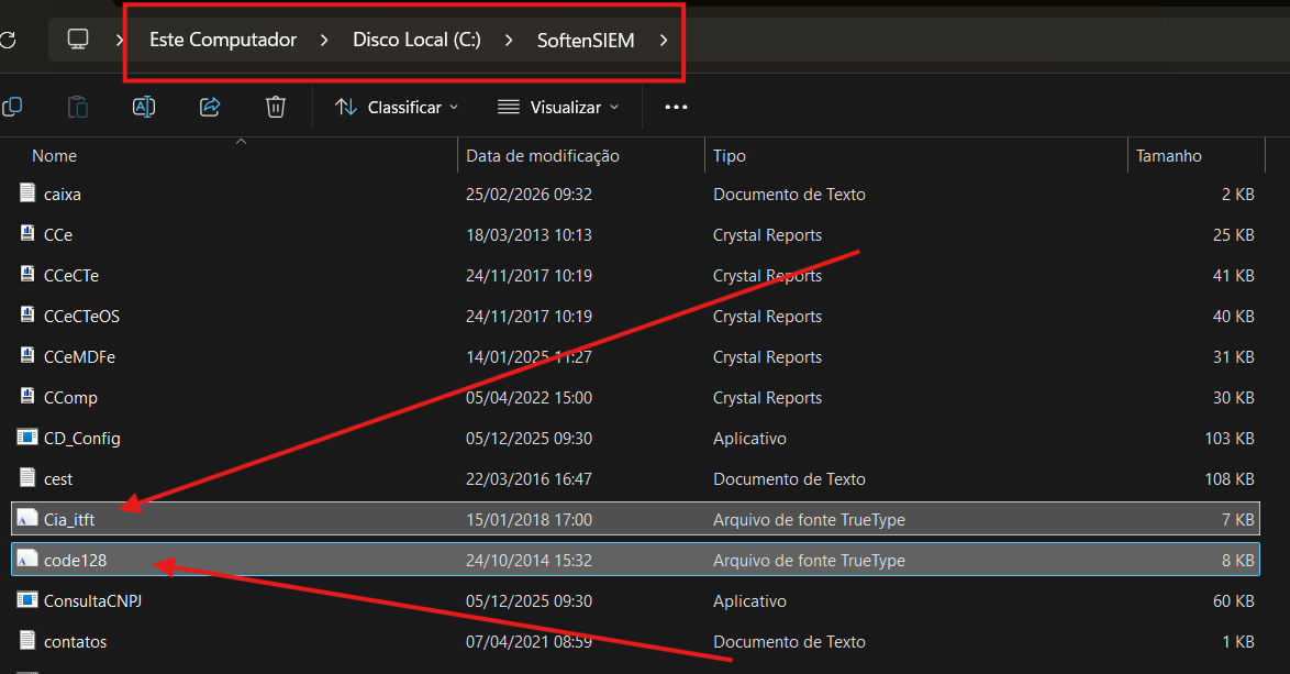 5.2) Caso os códigos de barra estejam com esses ícones, executar as fontes dentro da pasta SIEM mesmo que já funcionará, feche e abra de novo.